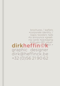brochures / leaflets •corporate identity / logos •posters •ads •to announce •greet- ing cards •packaging •roll-ups •3D visual- ization • dirkheffin©k graphic designer dirk@heffinck.be +32 (0)56 21 90 62